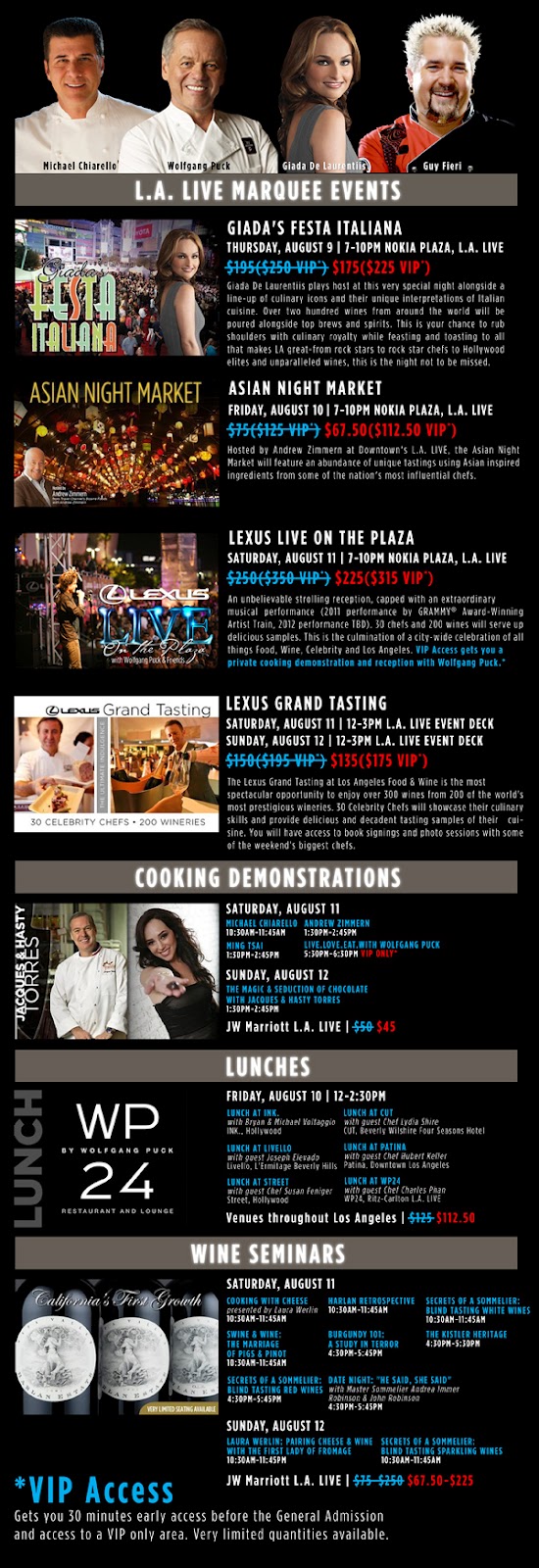 Attention all foodies and wine connoisseurs, we have a 10% discount off event tickets* to the 2nd Annual Los Angeles Food &Wine Festival occurring August 9-12, 2012! Events include lunch, brunch, dinner, and cooking demonstration events featuring famous chefs and many of Los Angeles' best restaurants and venues. This year's festival has events in Santa Monica, Downtown/L.A. Live, Beverly Hills, and Hollywood.